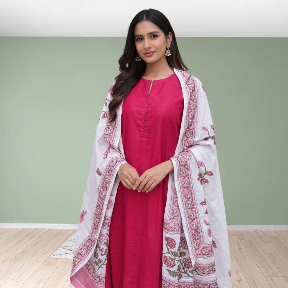 Enhance your ethnic wardrobe with this elegant women’s kurta with dupatta set, designed for comfort and timeless style. The kurta features a minimal solid design that offers a sophisticated look, while the beautifully printed dupatta adds a touch of traditional charm.