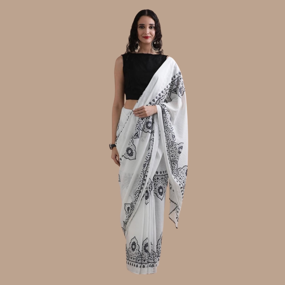 Whitemul cotton saree with mandala pattern handblock print. (With blouse)