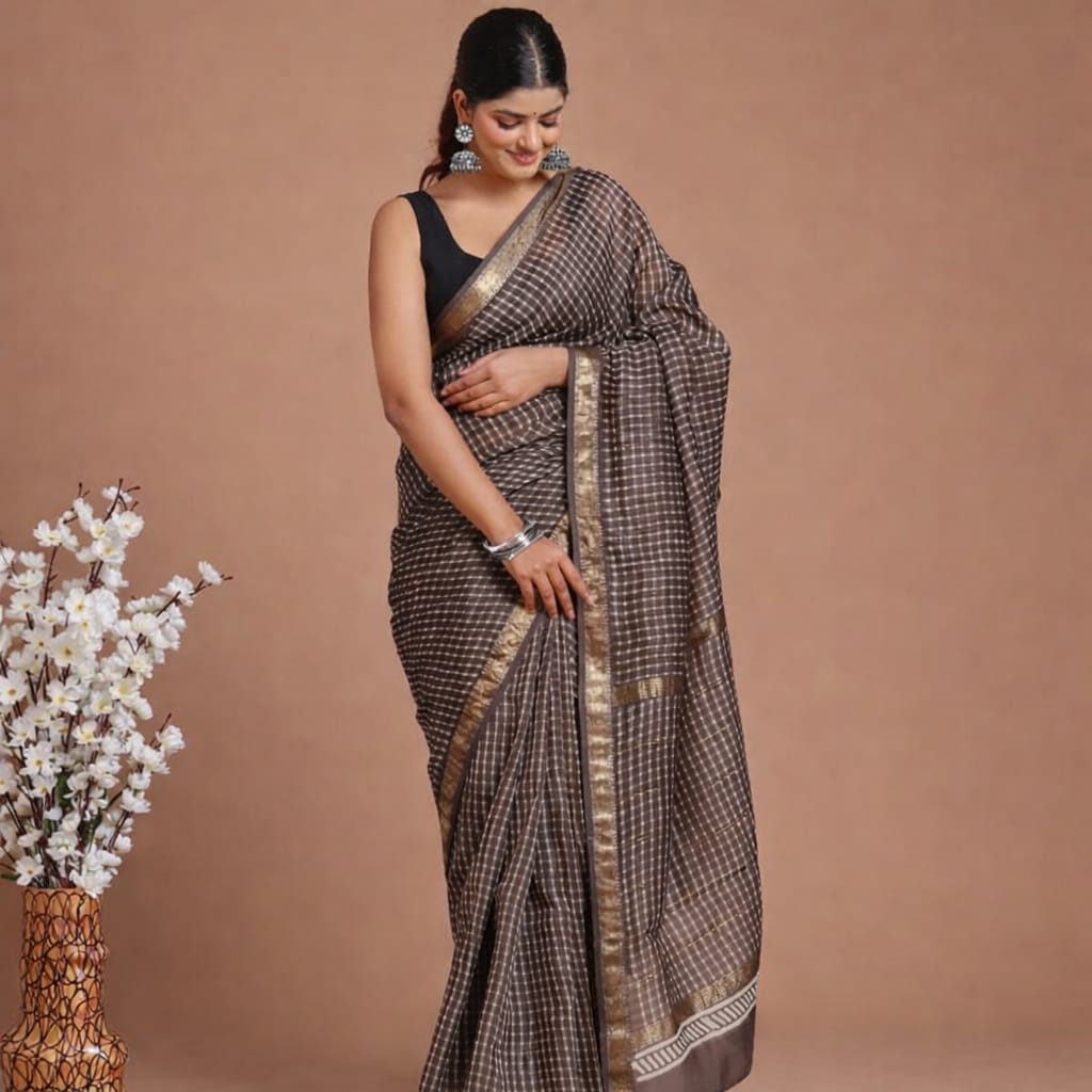 Handloomed Maheshwari Cotton Silk Saree features a handblock printed checkered pattern on a dove grey or brown-grey base accented with a delicate zari border (with blouse).